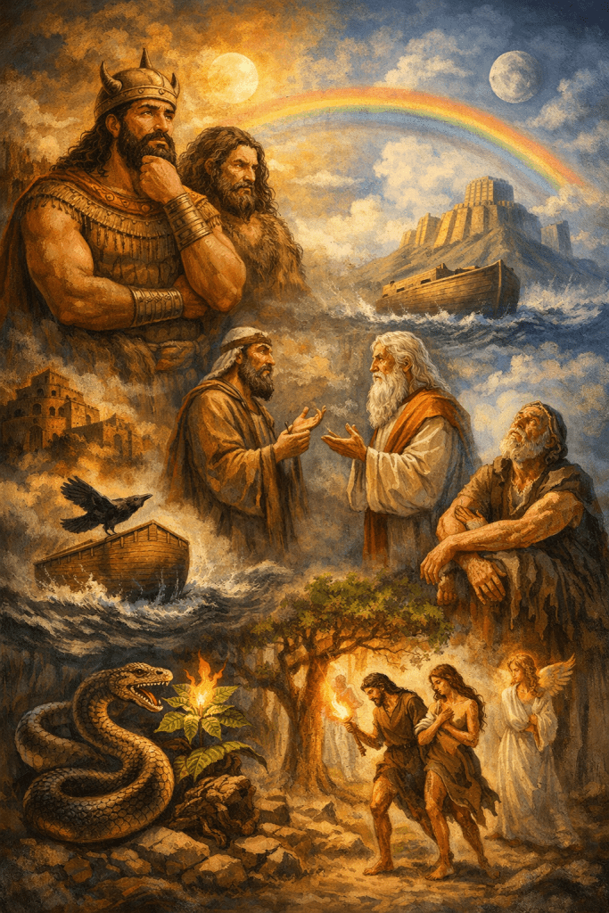 U tom kontekstu, komparacija s Biblijom otkriva i duboke sličnosti i temeljne razlike. Najpoznatija dodirna točka jest motiv potopa. U Epu o Gilgamešu, Utnapištim preživljava potop zahvaljujući upozorenju boga Ea. Potop je posljedica božanske odluke koja nije jasno utemeljena u moralnom poretku; bogovi djeluju impulzivno, a spasenje je iznimka. U biblijskom izvještaju o Noi (Post 6–9), potop ima jasan etičko-teološki smisao: riječ je o sudu nad ljudskom pokvarenošću, ali i o početku obnove svijeta kroz savez između Boga i čovjeka. Dok Utnapištim dobiva besmrtnost kao osobnu nagradu, Noa ne dobiva besmrtnost, nego obećanje Božje vjernosti i kontinuiteta života.