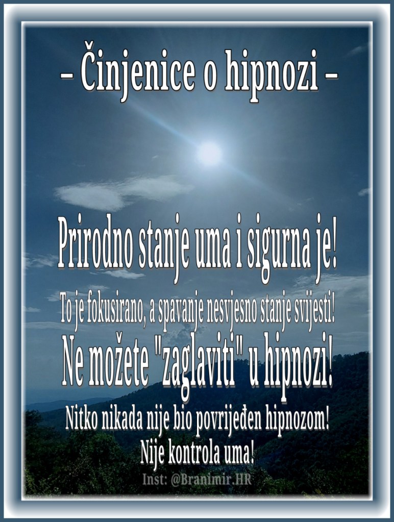 Hipnoza je prirodno stanje uma i potpuno je sigurna. Svaka osoba svakodnevno, svjesno ili nesvjesno, više puta ulazi u stanje hipnoze. Riječ je o učinkovitoj i moćnoj tehnici koja omogućuje uvođenje pozitivnih promjena u život pojedinca.